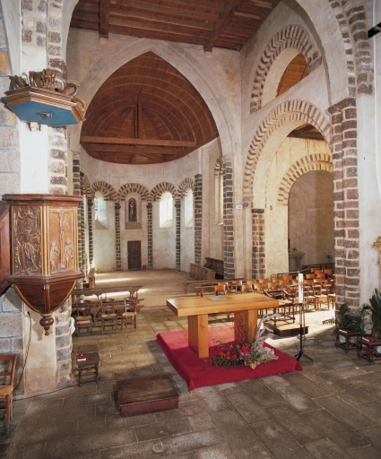 En 1863-64, le choeur subit d'importantes modifications, sous la direction de l'architecte Aristide Tourneux ; un nouveau mobilier y est alors installé : le maître-autel en pierre, de style néoroman, porte, sur les ailes du tabernacle la représentation des évangélistes et de prophètes. Il est aujourd'hui déposé dans la deuxième chapelle nord. Le peintre verrier vitréen Chauvel se charge des 7 verrières - dont il ne reste plus aujourd'hui que celle de la baie 0, consacrée à l'Assomption -, tandis que le menuisier Jamois fabrique les stalles. C´est probablement lui qui remonte la chaire à prêcher, en incorporant à la cuve des panneaux anciens (17e siècle ?). C´est lui, enfin, qui réalise la tribune.