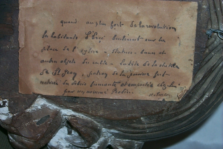 Sur un papier fixé au revers, inscription signée de l'abbé Parlange (vers 1900) : "Quand au plus fort de la Révolution, les habitants d'Ercé brûlèrent sur la place de l'église statues, bancs et autres objets du culte, la tête de la statue de saint Jean, patron de la paroisse, fut retirée des débris fumants et emportée chez lui par un nommé BODIN".