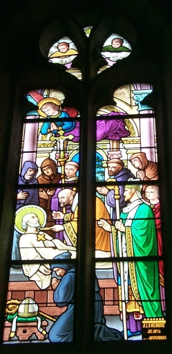 Ensemble des 3 verrières à personnages des baies 0 à 2 : Couronnement de la Vierge, Prédication et mort de saint Melaine,