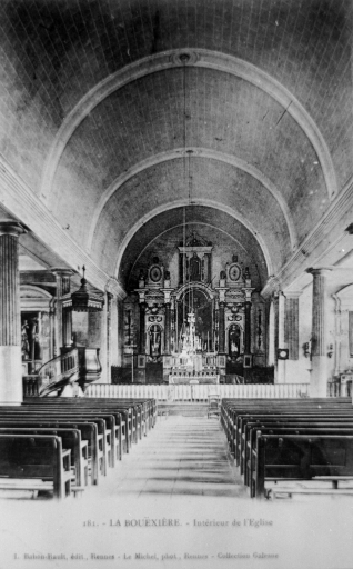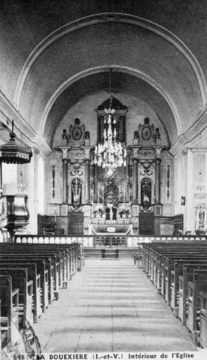 L´importante reprise de l´église paroissiale de la Bouëxière entre 1844 et 1846 par l´architecte Anger de La Loriais a entraîné un réaménagement complet de l´édifice. Si le retable du maître-autel, oeuvre de la 2e moitié du 17e siècle, est réinstallé dans le choeur, l´autel et le tabernacle sont remplacés en 1846 par le marbrier rennais Charles Patou qui réalise également les deux autels secondaires ; ces derniers sont placés devant des retables néo-classiques à pilastres cannelés et fronton cintré dont les tableaux originaux, disparus, ont été remplacés en 1945 par des toiles de Mme E. Ker Launay.