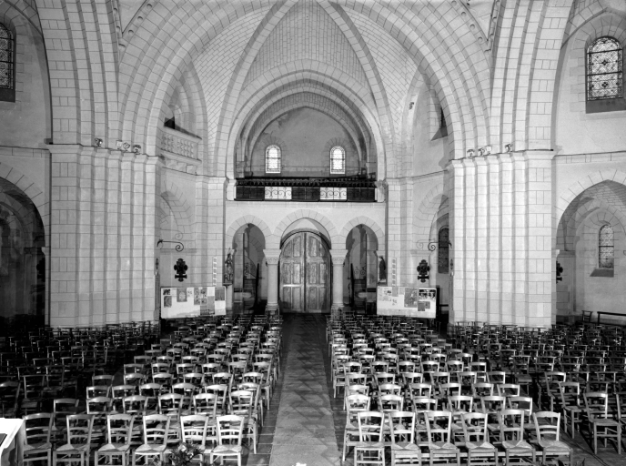 Les vitraux de l'église sont réalisés dans un style néo-roman ; les verrières figurées et à entrelacs d'animaux fantastiques des chapelles latérales, ainsi que la grande baie dédiée à saint Michel au bas-côté sud-ouest de la nef et réutilisant un remplage ancien, sont les plus intéressantes, le reste du décor des vitraux utilisant un simple répertoire géométrique. Par convention on considère que l'église est orientée est-ouest ; les verrières sont numérotées impaires au nord, paires au sud, en commençant par l'est.