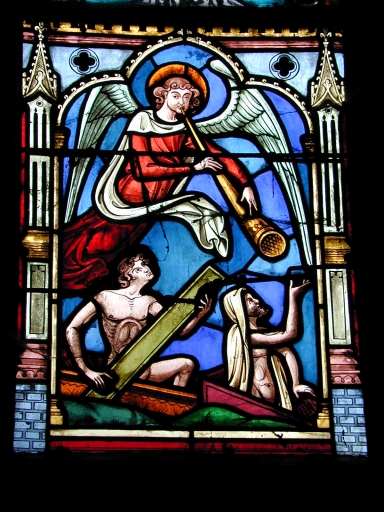 Verrière réalisée en 1891 dans un remplage ancien remployé lors de la construction de l'église actuelle. Son accès est aujourd'hui occulté.