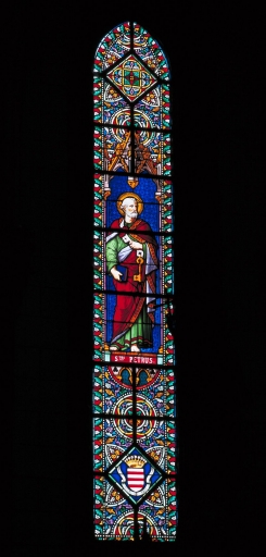 Baie 0 : inscription peinte sur l'étendard : ECCE AGNUS DEI ; armoiries et devise de Mgr Brossay Saint-Marc dans partie inférieure. Baie 1 : inscription peinte sous le personnage : Stus PETRUS ; armoiries sous une couronne comtale : d'argent à 3 bandes de gueules ; devise : TOUT DU TOUT. Baie 2 : inscription peinte sous le personnage : Stus PAULUS ; sur un parchemin : AD ROMANOS ; armoiries sous une couronne comtale : d'argent à 3 écrevisses de gueules ; devise : nec pallent nec recurrent [Ils ne pâlissent, ni ne reculent].