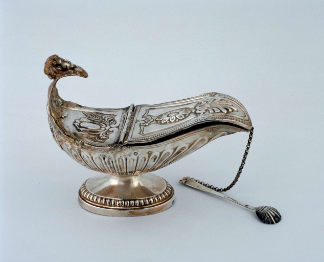 Poinçon de garantie et titre argent après 1838, sur le pied de la navette, le pied, le haut de la panse et le couvercle de l´encensoir ; poinçon de fabricant sur le pied de la navette et la frise du couvercle de l´encensoir : losange vertical, lettres J F séparées par un couteau à lame large / B. Sur la cuiller, 1er titre et moyenne garantie Paris 1819-1838, poinçon de fabricant : losange vertical, lettres A M entre 2 fleurettes.