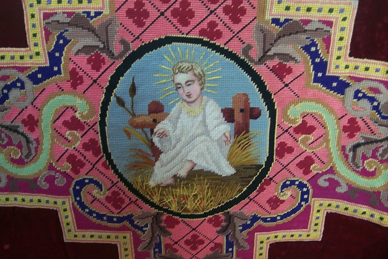 - soie, rouge velours uni, tapisserie au point, polychrome, application sur textile