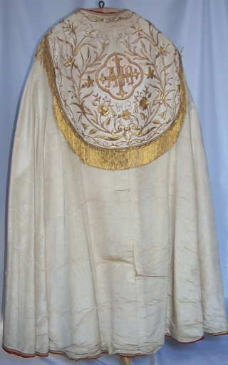 Ornement blanc 5 : chape, voile huméral, étole pastorale, chasuble, bourse de corporal, étole, voile de calice,