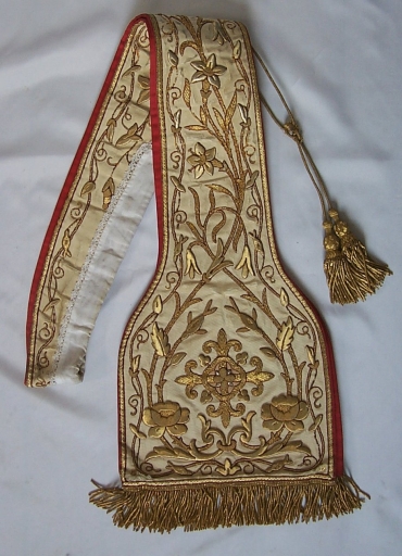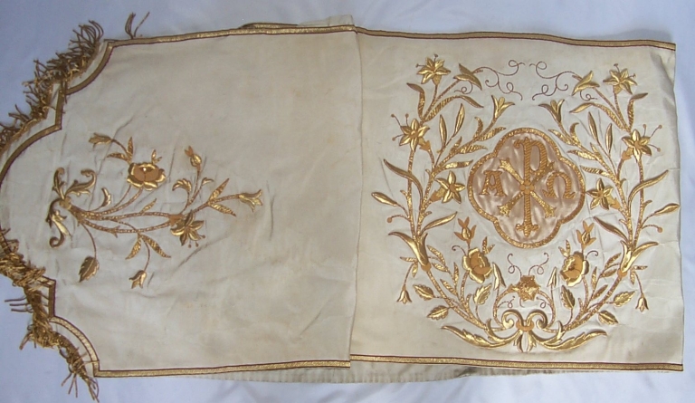 Dénominationschape, voile huméral, chasuble, bourse de corporal, étole, voile de calice