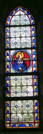 Le titre est donné dans chaque médaillon, le nom du donateur au bas de chaque verrière. Baie 9 : STE ANNE / DONNE PAR MME ANNE HOCHARD. Baie 10 : ST ALPHONSE / DONNE PAR MR ALPHONSE DESCURES. Baie 11 : ST JEAN / DONNE PAR MR L'ABBE CHEVAL PTRE DE LA PAROISSE. Baie 12 : ST LOUIS / DONNE PAR MR DUCLOYER PEINTRE A REDON. Baie 13 : ST MARC / DONNE PAR MR JN ME BAUDU. Baie 14 : ST JULIEN / DONNE PAR MR E. DUPUIS ARCHITECTE DE L'EGLISE. Baie 15 : ECCE AGNUS DEI / DON DE MR GOUZET RTEUR DE LA PAROISSE ET MR MORIN VRE DE RENAC. Baie 16 : STE ANNE / DONNE PAR MME ANNE HOCHARD.