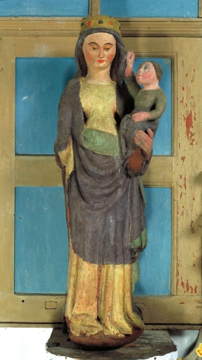 Il manque le bras droit de la Vierge et les pieds de l'Enfant. Fente partant du bas.