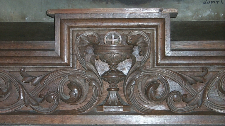 - chêne, mouluré, tourné, ajouré, décor en bas relief, décor rapporté, teint, vernis