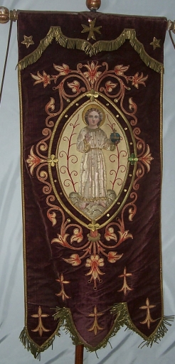 Bannière de procession : saint Jean Berchmans et l'Enfant Jésus,