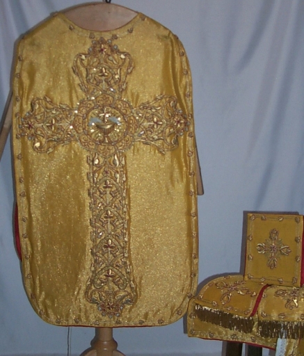 Ornement doré : chasuble, bourse de corporal, étole, voile de calice, manipule,