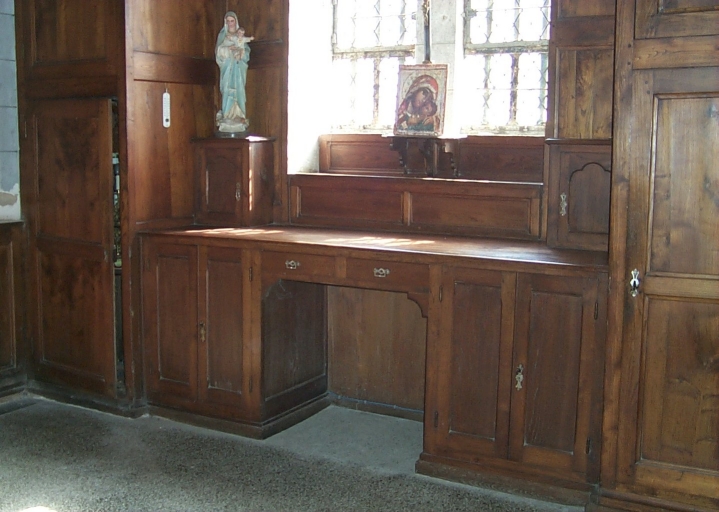 Ensemble des meubles de la sacristie : chasublier, 7 armoires, un bureau,