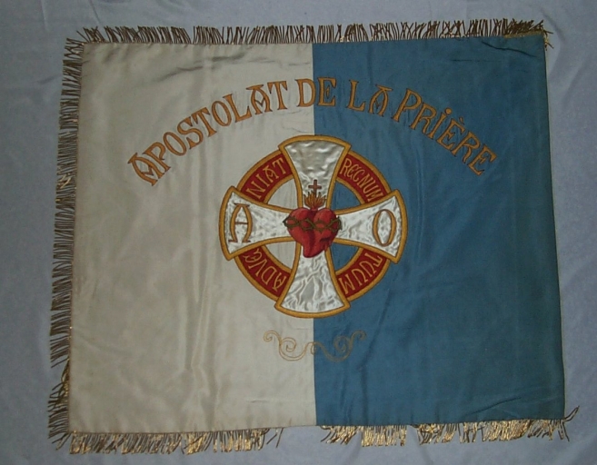 Inscription brodée sur une face : CROISADE EUCHARISTIQUE / LA CHAPELLE St MELAINE ; sur le cercle circonscrivant la croix : ECCE PANIS ANGELORUM. Sur l'autre face : APOSTOLAT DE LA PRIERE ; sur le cercle circonscrivant la croix : INVENIAT REGNUM TUUM.