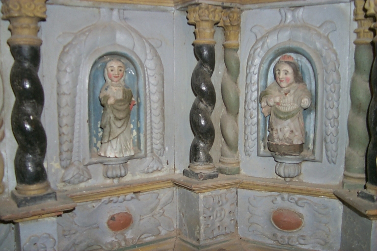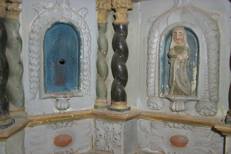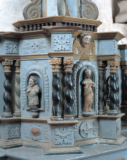 L'oeuvre a été repeinte anciennement. Il manque l'une des 5 statuettes ; quelques fissures et nombreux éclats dans la peinture ; les volutes de la partie supérieure sont en mauvais état.
