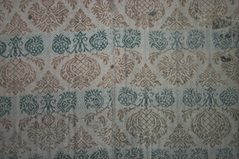 L'intérieur du meuble est garni de plusieurs pièces de tissu ancien.