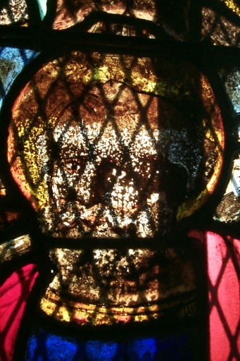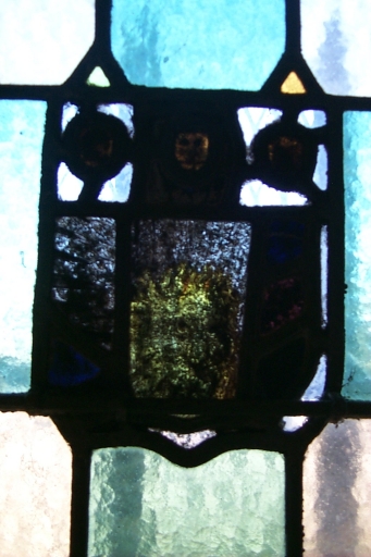 Quelques morceaux de la verrière sont remontés dans les fenêtres de la sacristie (mur nord et mur est) . Les verres sont très encrassés.
