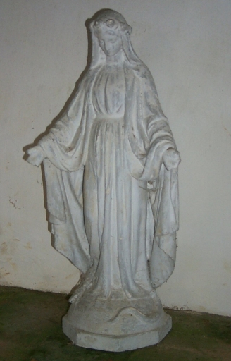Statuette : Immaculée Conception : plâtre : moulé, peint ; 74 H. Nombreux éclats dans la peinture. Les doigts des deux mains sont cassés. 1er quart 20e siècle (?). Fig. 4.