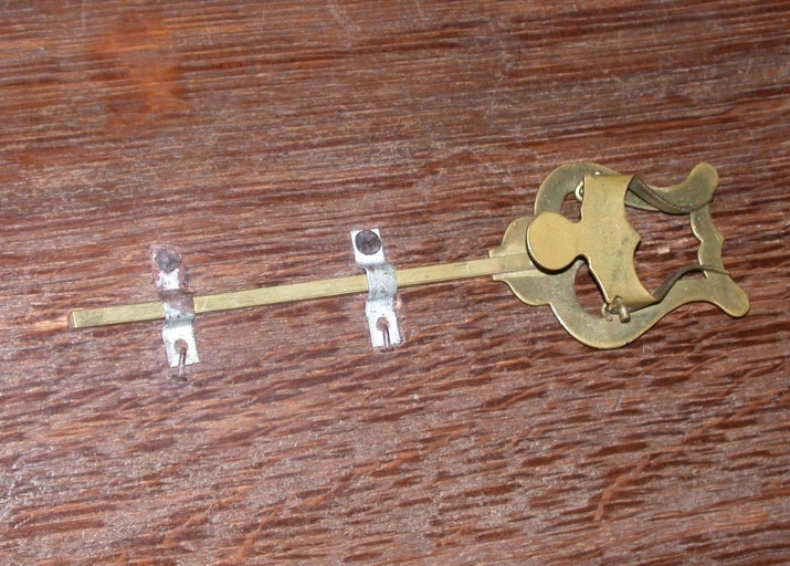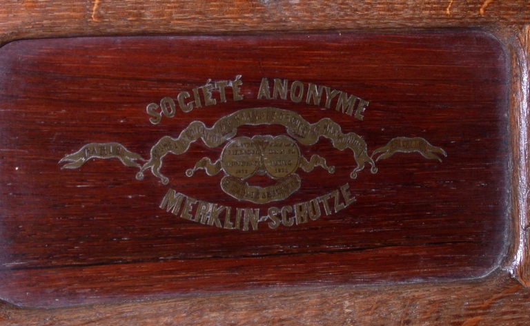 Inscription peinte en doré : SOCIETE ANONYME / POUR LA FABRICATION DES GRANDES ORGUES ET HARMONIUMS / ETABLISSEMENTS / MERKLIN- SCHUTZE. Entre les deux, sur des phylactères ou des médailles : à gauche : PARIS ; au centre : GRANDE MEDAILLE / LONDRES / 1851 / MEDAILLE / DE 1e Cl. / 1855 ; à droite : BRUXELLES.