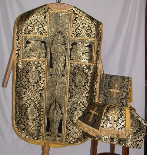 Ornement noir : chasuble, bourse de corporal, étole, manipule, voile de calice,