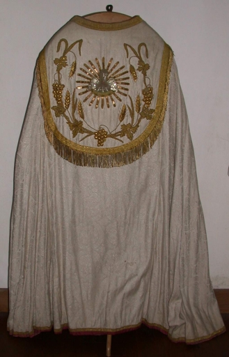Chape 1 : soie (blanche) : tissu façonné, application sur textile, adjonction d'éléments ; fil métal : doré. Le tissu est coupé par l'usure. 1er quart 20e siècle. Représentation : pélican mystique ; rayons ; vigne ; blé. Fig. 22.