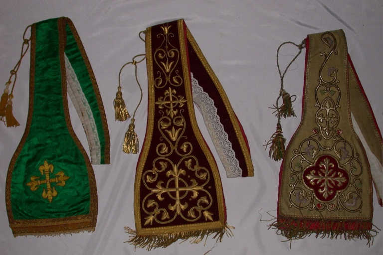 Etole pastorale 2 : soie (rouge) : velours uni, application sur textile. Limite 19e siècle 20e siècle. Représentation : croix fleuronnée ; rinceau. Fig. 24.