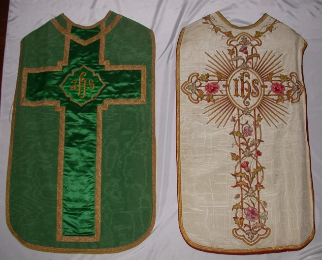 Ornement vert 2 : chasuble, bourse de corporal, étole, manipule : soie (verte) : gros de Tours, moiré, application sur textile, satin, brodé, polychrome. Il manque le voile de calice. 1er quart 20e siècle. Représentation : IHS ; quadrilobe. Fig. 17.
