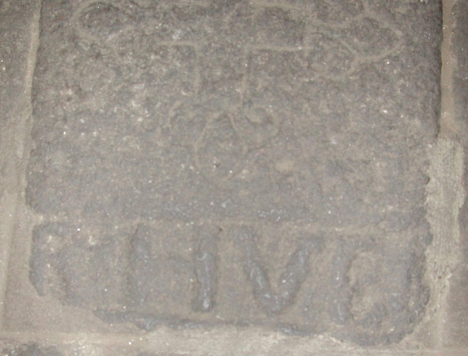 Dalle funéraire 2 : granite : décor à fond en cuvette ; 172 l. Inscription presque illisible : PIOCHE : S. 17e siècle. Représentation : croix pattée sur degrés. Fig. 5 et 6.