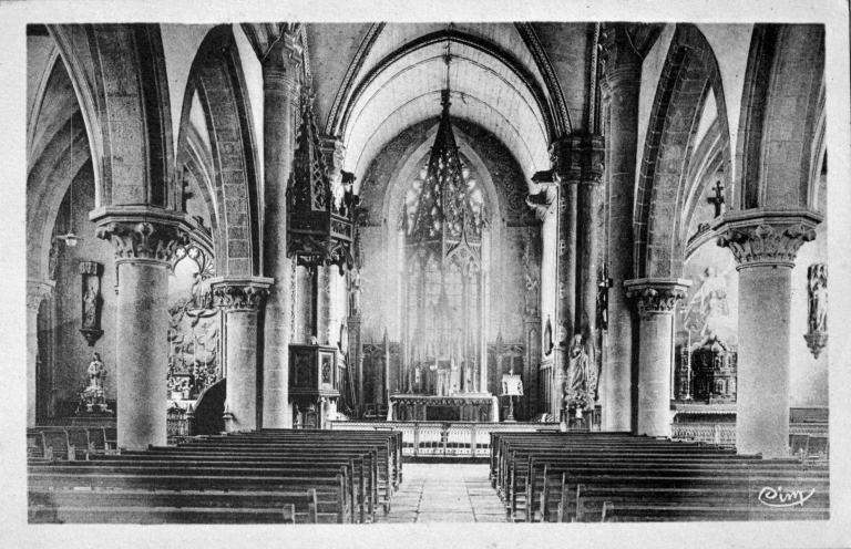 Ornement blanc 1 : chasuble, étole, voile de calice : soie (blanche) : tissu façonné, application sur textile ; soie (blanche) : tissu façonné, polychrome. Il manque la bourse de corporal et le manipule ; le tissu du décor est usé ; quelques reprises. 1er quart 20e siècle. Représentation : IHS ; mandorle ; rinceau fleuri. Fig. 27.