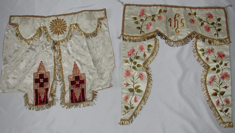 Pavillon de ciboire 1 : soie (blanche) : gros de Tours, moiré, application sur textile, adjonction d'éléments ; fil métal : doré, argenté. Limite 19e siècle 20e siècle. Représentation : coeur enflammé ; croix ; fleur. Fig. 21.