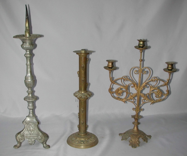Paire de Chandeliers d'autel : métal : fonte, doré ; 45, 5 h. Les chandeliers ont été peints en faux argent. 4e quart 19e siècle. Fig. 15.