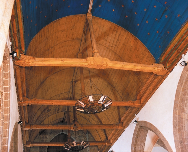 Ornement doré 3 : chasuble, bourse de corporal, étole, étole pastorale, manipule : soie (jaune) : drap d'or, application sur textile, adjonction d'éléments ; fil métal : doré. Il manque le voile de calice. 1er quart 20e siècle. Représentation : chrisme ; cercle ; quadrilobe ; croix ; fleurons. Fig. 27.