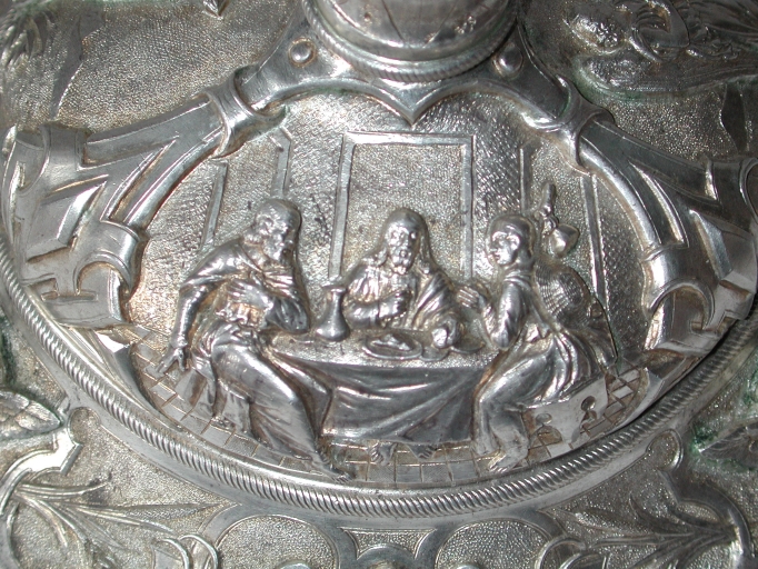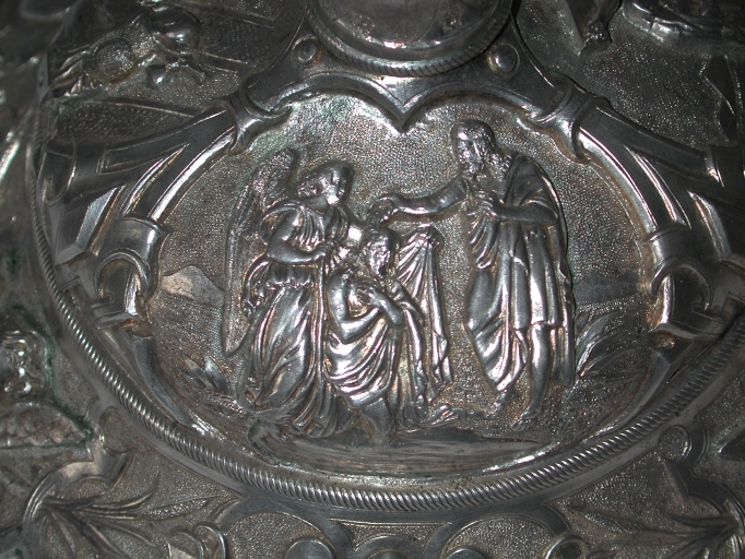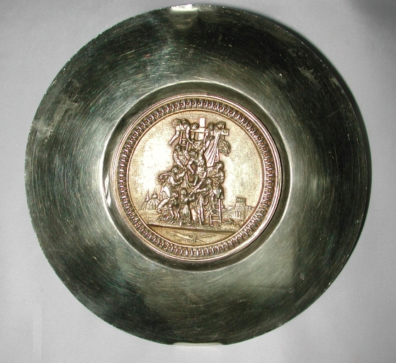 L'aile de la patène est légèrement cabossée, sous la scène.