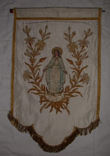 Bannière de procession 1 : Immaculée Conception : soie (blanche) : gros de Tours, application sur textile, brodé, polychrome ; soie (bleue) : satin, application sur textile, adjonction d'éléments ; fil métal : doré ; toile (support) : peinture à l'huile ; 85, 5 H. 1er quart 20e siècle. Fig. 11 et 12.