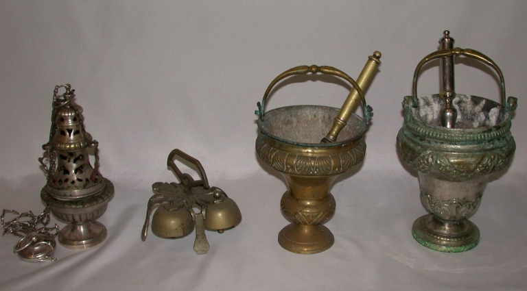 Sonnette liturgique : métal : fonte, argenté ; 14,5 la. Oeuvre déposée ; il manque 2 clochettes ; l´argenture a pratiquement disparu. 1ère moitié 20e siècle. Fig. 13.