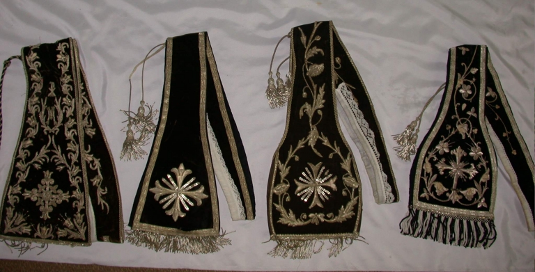 Ensemble de 4 étoles pastorales : soie (noire) : velours uni, application sur textile, adjonction d´éléments ; fil métal : argenté . Limite 19e siècle 20e siècle. Représentation : croix ; rayons ; ornementation végétale. Fig. 31.