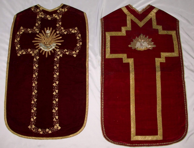 Ornement rouge 4 : chasuble : soie (rouge) : velours uni, application sur textile, adjonction d´éléments ; fil métal : doré, argenté. Il manque la bourse de corporal, l´étole, le manipule et le voile de calice. 1er quart 20e siècle. Représentation : calice ; hostie ; rayons ; croix ; ancre ; ornementation végétale. Fig. 28.