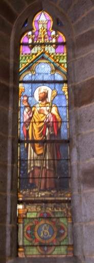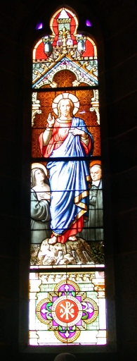 Les personnages sont identifiés par des initiales inscrites dans un quadrilobe dans la partie inférieure de la verrière ; baie 1 : SA ; baie 3 : chrisme ; baie 5 : SF ; baie 7 : SI.