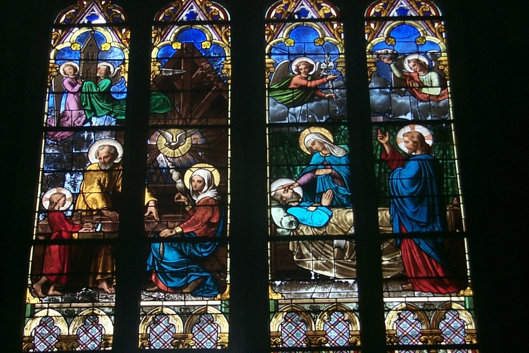 Ensemble des verrières à personnages des baie 117 et 118 : Assomption, scènes de la vie de saint Joseph,