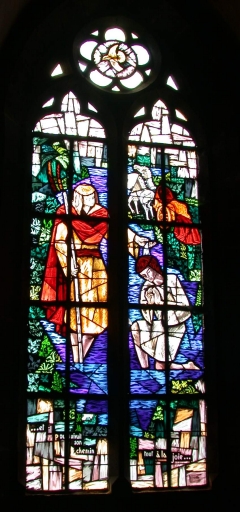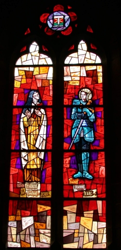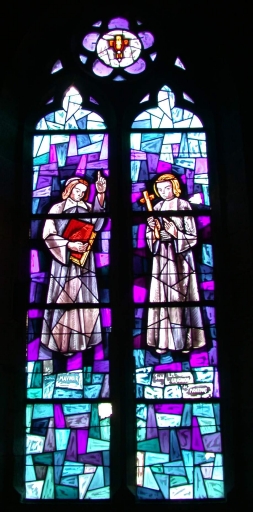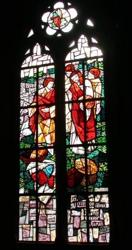 Signature dans les verrières des baies 26 : R B, et 29 : Robert Briand : Rennes. Inscription sous chaque personnage et dans les petites roses. Baie 20 : Bx Julien MAUNOIR / Saint LM GRIGNON de Montfort. Baie 22 : Sainte BERNADETTE / Sainte Maria GORETTI / armoiries de Paul VI. Baie 23 : St Dominique SAVIO / St Jean EUDES / SSts Coeurs de Jésus et Marie. Baie 24 : Saint CURE D´ARS / saint PIE X. Baie 25 : Sainte THERESE de l´enfant JESUS / Sainte JEANNE D´ARC / armoiries et devise (IN SPIRITU ET VERITATE) de l´évêque de Rennes, Mgr Gouyon (?). Baie 26 : CELUI QUI CROIT EN MOI N´AURA PAS FAIM / ET CELUI QUI CROIRA EN MOI N´AURA JAMAIS SOIF. Baie 27 : JEAN XXIII / J M DE LAMENNAIS / FRERES de PLOËRMEL ; FILLES DE LA PROVIDENCE. Baie 29 : et il poursuivait son chemin tout à la joie.