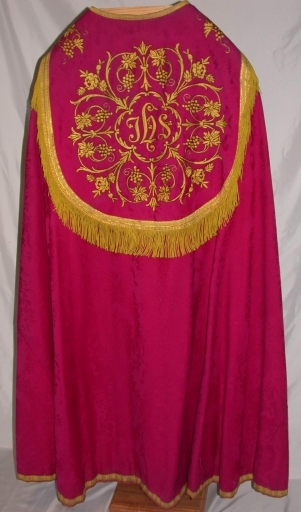 Chape rouge : soie (rouge) : tissu façonné, brodé, application sur textile. 1er quart 20e siècle. Représentation : IHS ; quadrilobe ; rinceau fleuri ; vigne. Fig. 25.