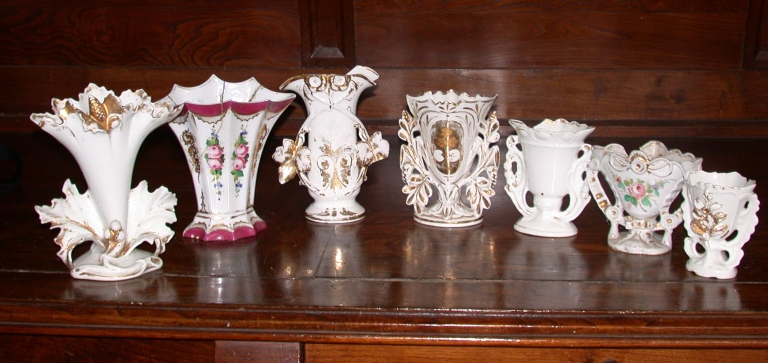 Paire de vases d´autel : porcelaine (blanche) : moulée, dorée ; 13 h. La dorure est lacunaire. 4e quart 19e siècle. Représentation : Vierge à l´Enfant ; saint Joseph ; ornementation végétale. Fig. 21.