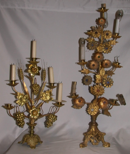 Paire 1 de chandeliers d´église : métal : fonte, doré ; 51 h. 4e quart 19e siècle. Représentation : fleurs de lys, blé, vigne. 5 lumières en chevron. Fig. 13.