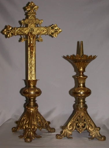 Garniture d´autel : croix d´autel, 4 chandeliers d´autel : métal : fonte, doré ; 69 h croix / 40 h chandelier. L´un des chandeliers a été transformé en chandelier pascal. 4e quart 19e siècle. Représentation : ornementation végétale. Fig. 9.