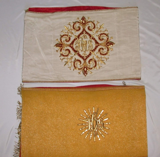 Ornement doré 1 : chasuble, bourse de corporal, étole, manipule, voile de calice : soie (jaune) : drap d´or, application sur textile, adjonction d´éléments ; soie (rouge, bleue) : tissu façonné, application sur textile ; fil métal : doré. Le drap d´or est très usé, surtout aux épaules. 1er quart 20e siècle. Représentation : IHS ; polygone ; croix. Fig. 40.