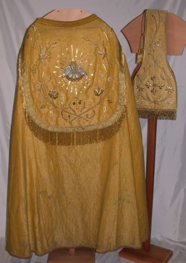 Chape dorée 1 : soie (jaune) : drap d´or, application sur textile, adjonction d´éléments. Le tissu est très usé aux épaules. 1er quart 20e siècle. Représentation : pélican mystique ; rayons ; rinceau fleuri ; blé ; vigne ; roses. Fig. 31.