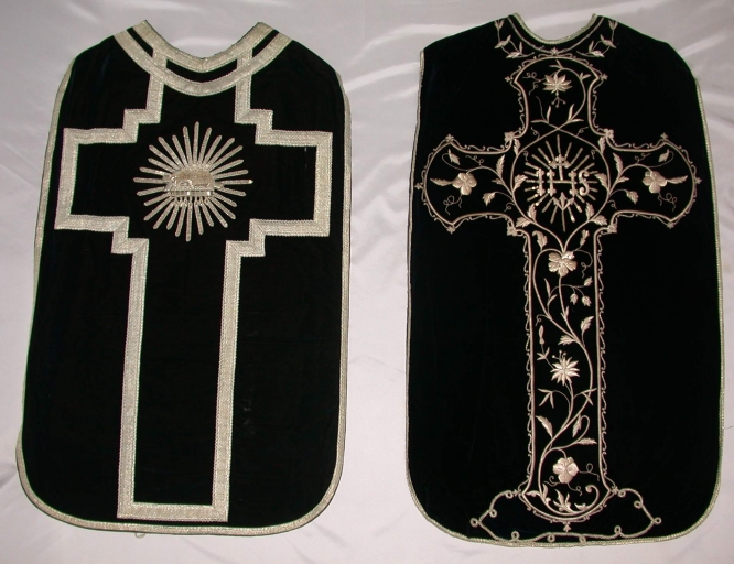 Chape noire 2 : soie (noire) : tissu façonné, application sur textile, adjonction d´éléments ; fil métal : argenté. 4e quart 19e siècle (?). Représentation : IHS ; couronne d´épines ; rayons. Pas de Fig.