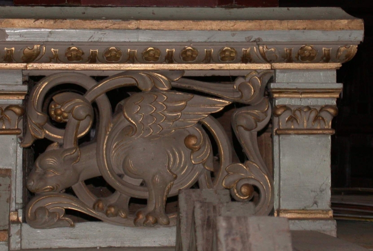 - bois, mouluré, découpé, décor dans la masse, décor en bas relief, peint, polychrome, peint à la poudre d'or