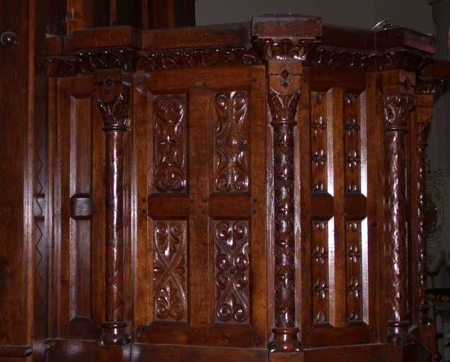 - bois, mouluré, tourné, décor dans la masse, décor en bas relief, teint, vernis