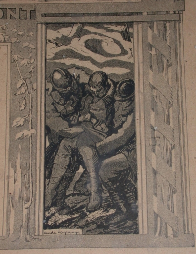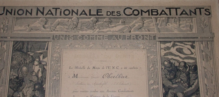 Signature au bas des gravures : Andi Lagrange. Inscription : UNION NATIONALE DES COMBATTANTS / UNIS COMME AU FRONT / La Médaille du Mérite de l'U.N.C. a été conférée / à Monsieur Louis Oberthur / Secteur de Monterfil (I. & Vilaine) / pour services rendus aux Anciens Combattants / et Victimes de la Guerre / Promotion du XVIIe Congrès National (1936) / Le Président de l'UNC / MEDAILLE DE BRONZE / U N C.